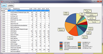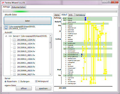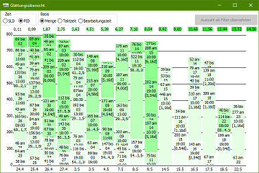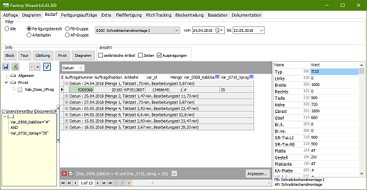 In einem weiteren Schritt wurden diese Auflösung weiter optimiert, so das eine Produktionsvorschau von mehren Wochen möglich wurde. In Kombination mit den umfangreichen Abfragemöglichkeiten konnten sich die einzelnen Bereiche selbständig Optimieren. | |