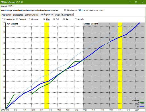 | Über das Pitchtracking werden die Zeitvorgaben für die einzelnen Bereichen bestimmt. Hierbei wird die zeitliche Belastung mit der Anzahl verfügbarer Mitarbeiter und einem Zeit- bzw. Schichtplan verbunden. Dieser wird als Zeitdiagramm über den Bändern dargestellt und dient als Grundlage für Prämie. |